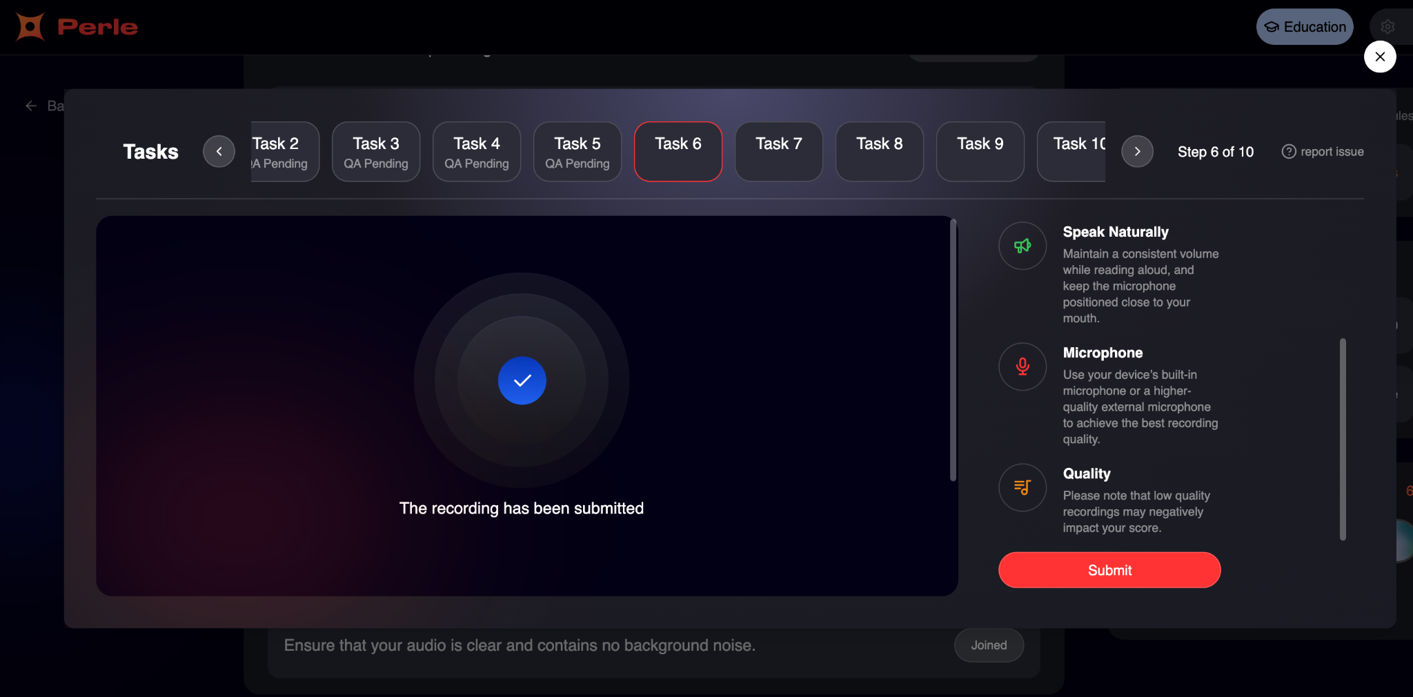 You can replay your take and re-record as many times as you want. When you’re ready, press Submit Recording, then confirm the final submission. You should see “QA Pending” on the task, which means it was submitted correctly.